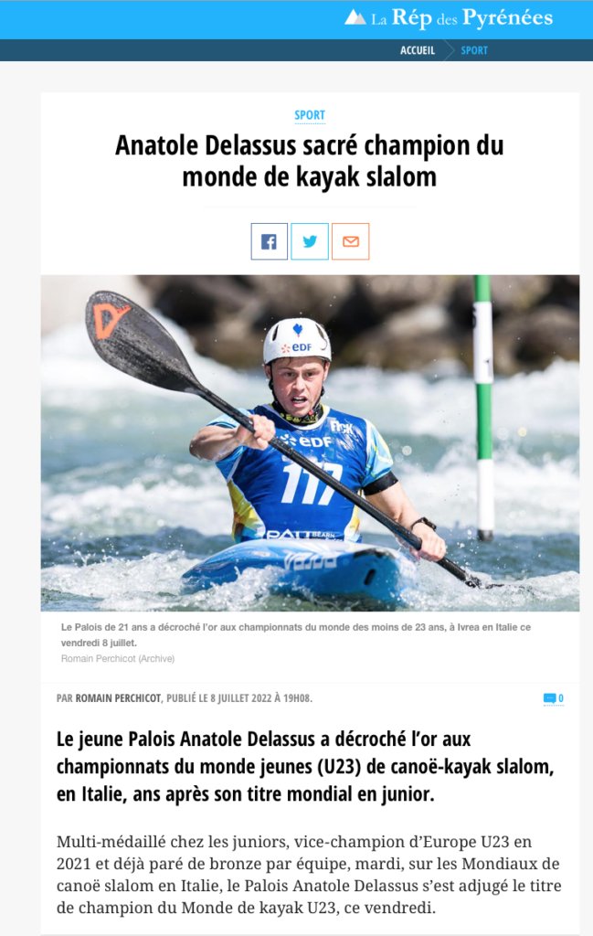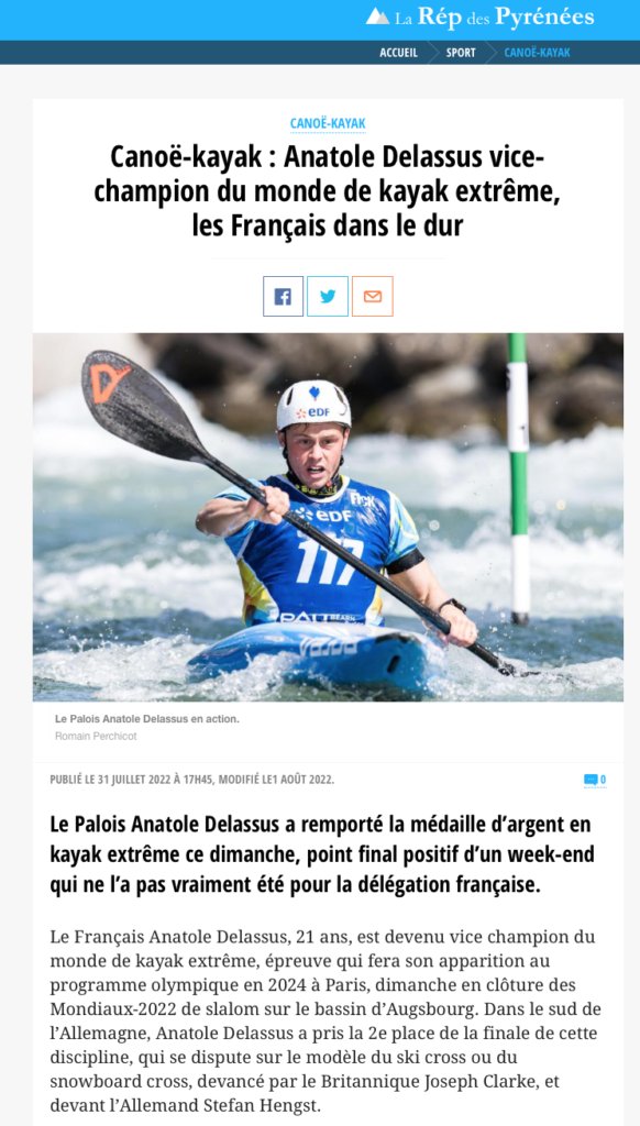 Après son titre de champion du monde des jeunes (U23) obtenu le 8 juillet 2022 dans la discipline du canoë-kayak slalom, notre jeune Joinvillais récidive le 31 juillet 2022 pour une seconde place mais cette fois dans une autre discipline très spectaculaire le kayak extrême.